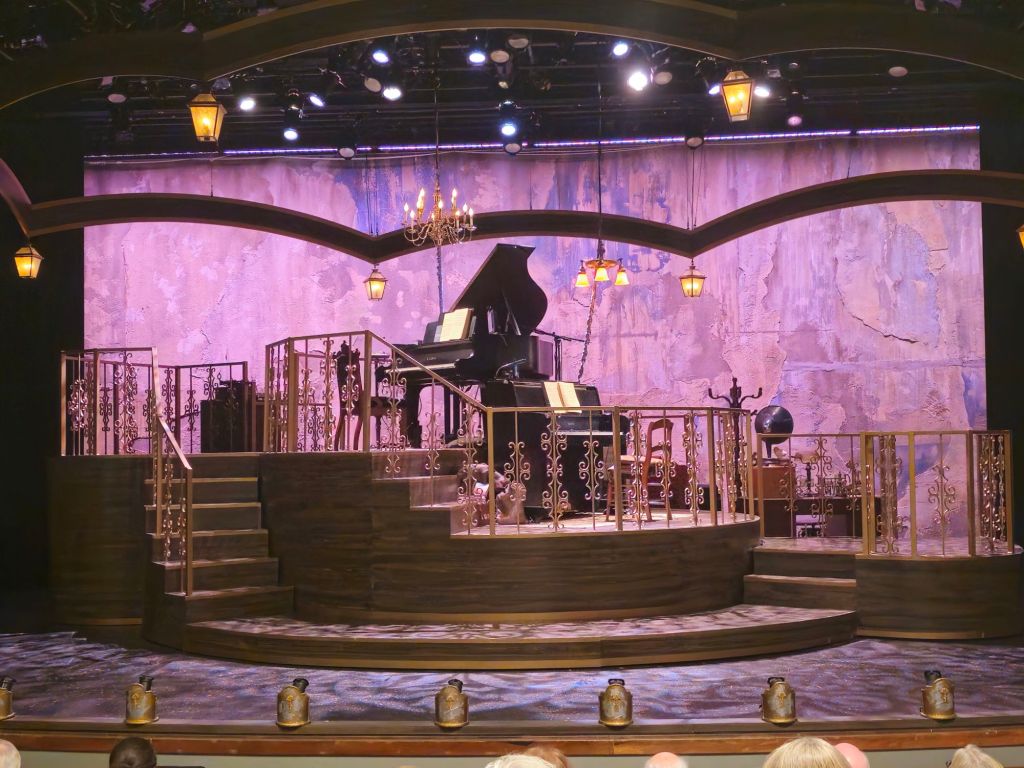 Class distinctions are felt at every layer in this production – even the instrumentation! The music in this production was newly arranged for two pianos by Trude Rittman, with conductor Joshua Burniece in formalwear playing on a grand piano while Wesley Frye wears more casual dress on a smaller piano. Both musicians are on stage for the entire show, sometimes even interacting with the cast. It’s an inspired choice, and one that shows a smart director can always find new ways to showcase a musical’s ideas, even into the music.