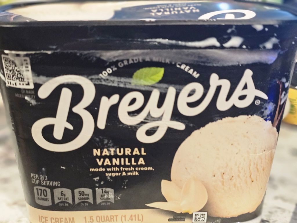 This is also as good a time as any to point out there’s no actual cooking involved in the making of this sauce. That’s the most curious part to me – more so than even the ingredients. If I were to try making a sauce with these ingredients I’d probably start by sautéeing the vegetables and garlic in a saucepan for a while, which would release some of the moisture and sugars inside, and then add the liquids and simmer until it has reduced and thickened. Also, since he wants the red peppers to be peeled, I’d prefer to roast them under my broiler until they get some char and then peel the skin away after that. But we’re trying to stay true to the scene, so no cooking – just mixing it all together in a chilled bowl. After all, as Bill says, “it’s how you put them together”. So what happens next? That’s right… we mix in Bill’s secret ingredient – one that he supposedly heard from an old chef friend. One quart of vanilla ice cream.