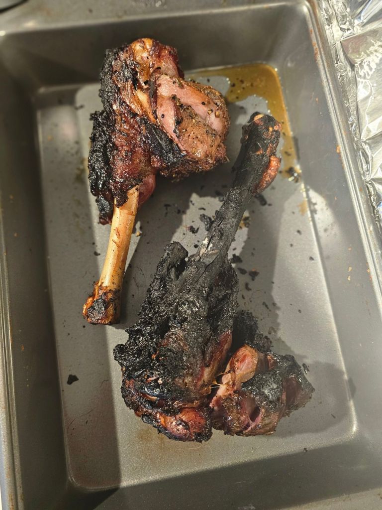 Now that we’ve got the sauce settled, it’s time to move on to our protein. Given this recipe is all about the sauce, I’m not going to be too precious about the lamb – I’m going with a pre-seasoned lamb shank readily available from a nearby Wal-Mart. Since this is supposed to be served for a barbecue I’m going to be cooking in my portable grill with wood pellets for smoke. The punch line of the scene seems to be that Gannon uses this sauce because he doesn’t like the taste of lamb (“you put it on lamb, you never know it’s lamb!”). But I do like lamb, so we’ll have to see how it shakes out once the lamb is finished cooking.
