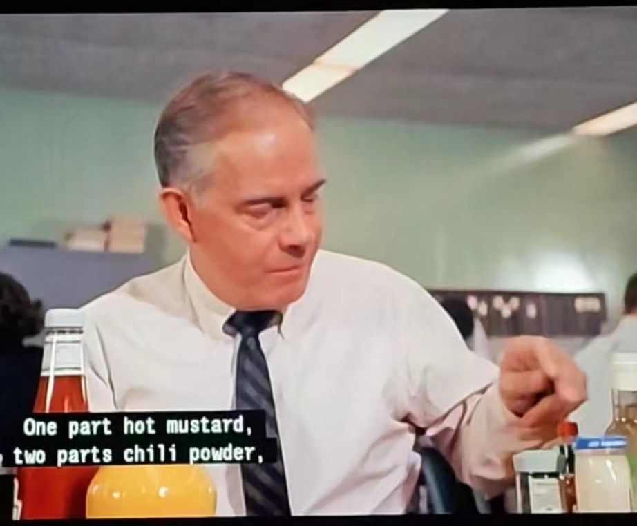 Also presumably adding heat as well as other tangy flavors is the “can of hot mustard”. Now, he could theoretically be talking about a can of something like Colman’s Hot Mustard powder, but as you can see above, the prop department has given Harry Morgan what appears to be a jar of Grey Poupon. There doesn’t seem to be a hot mustard variant of Grey Poupon on the market today, so I went online to find a hot mustard in a similar-looking container. I settled on Lowensef, an extra-hot German mustard that comes in 9oz glass jars. I figure Bill Gannon would approve, as throughout the series his rather… exotic palate was a consistent source of comic relief, to the point where two of his sandwiches have been featured on the YouTube channel Sandwiches of History.
